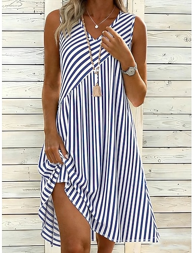 Mulheres Vestido no Joelho Vestido casual Casual Ajuste Largo Gráfico Listra Sem Manga Decote V Azul Verão Primavera
