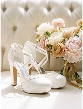 Sapatos de noiva femininos em renda marfim com salto plataforma e estampa floral - modelo elegante e romântico para casamentos na cidade.