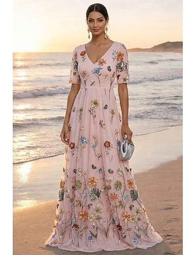 Linha A Vestidos Longo Até o Tornozelo Vestido Coquetel Vestido de convidada de casamento Vestido Para Mãe dos Noivos Manga Curta Decote V Elegante Casual Formal Convidado do casamento Semi formal