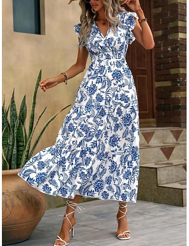 Mulheres Vestido Longo Vestido casual Vestido A Line Vestido floral Elegante Moda Moderno Ao ar livre Férias Para Noite Normal Floral Manga Curta Decote V Azul Rosa Vinho Verde Tropa Verão Primavera