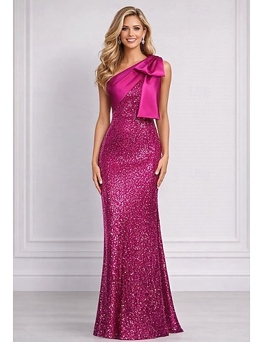 Tubinho Longo Vestido formal Vestido de noite Vestidos de noite Elegante Brilhante Sem Manga Assimétrico Baile de Formatura Formal Cetim Paetês com Laço(s)