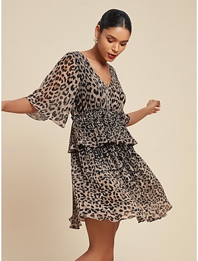 vestido curto marrom chiffon plissado estampa de leopardo decote em v meia manga para impressionar 2024