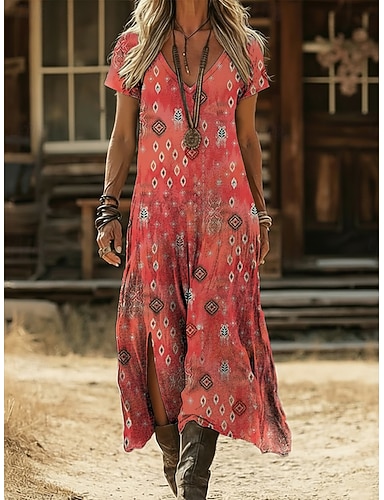 Mulheres Vestido midi Vestido Boho Vestido casual Vestido A Line Vestido estampado Vintage Ao ar livre Férias Final de semana Ajuste Largo Gráfico Bloco de cor Manga Curta Decote V Fúcsia Verão