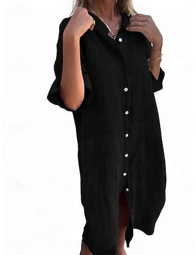 Mulheres Vestido midi Vestidos de algodão e linho Camisetão Vestido casual Elegante Moda Moderno Diário Ao ar livre Férias Ajuste Largo Tecido Meia Manga Colarinho de Camisa Azul Preto Vermelho Roxo