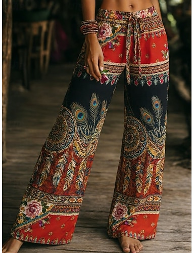 Mulheres Perna larga chinês Calças Férias Moda Boho Comprimento total Cintura Média Estampado Cashemere Bolsos Cintura elástica Imprimir Confortável Respirabilidade Sem Elasticidade Diário Ao ar
