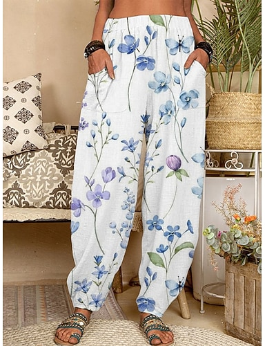 Mulheres chinês Calças Ativo Moda Longas Cintura Alta Floral Bolsos Cintura elástica Estampado Respirabilidade Macio Micro-Elástica Férias Rua Roupa Diária Azul Roxo Primavera Outono Normal