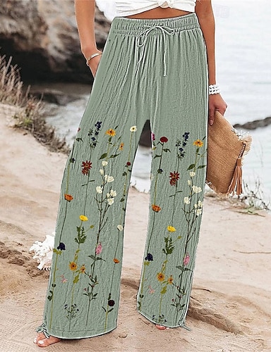 Mulheres Calças inspiradas em linho Perna larga Calça Palazzo Moda Boho Comprimento total Cintura Alta Flor Cintura elástica Confortável Respirável Micro-Elástica Rua Roupa Diária Para Noite Verde