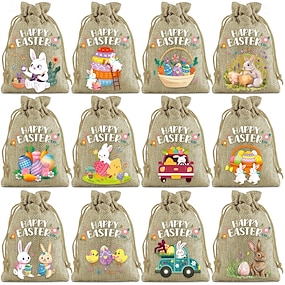 Conjunto de 12 sacolas de presente de Páscoa em juta com cordão, medindo 15 x 10 cm, com estampa de coelhinho da Páscoa, ovos coloridos e coelho. Ideais para pequenos presentes, joias, lanches e