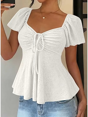 Mulheres Blusa Com Cordão Ilhó Côr Sólida à moda Sensual Casual Manga Curta Decote Quadrado Tops regulares Diário Preto Branco Amarelo Rosa Azul Céu Verão Primavera