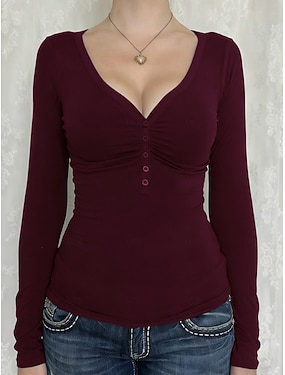 Mulheres Pequeno Camiseta Y2K Top ajustado Frente do botão Pregas Côr Sólida Elegante à moda Sensual Manga Longa Decote V Tops regulares Diário Para Noite Final de semana Preto Vermelho Azul Marinha