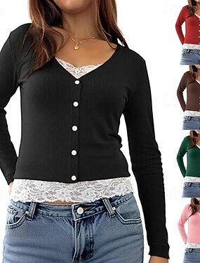 Mulheres Blusa Renda Patchwork Botões Côr Sólida Elegante à moda Casual Manga Longa Decote V Tops regulares Diário Preto Rosa Vermelho Marron Verde Primavera Outono Inverno