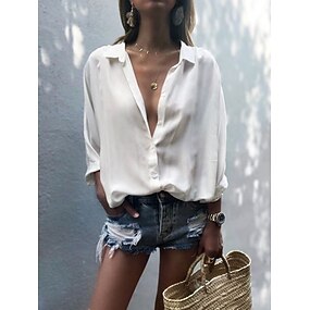 Mulheres camisa de verão Camisa casual camisa de botão Blusa Botões Côr Sólida Férias à moda Casual Manga Longa Aberto para a Lateral Tops regulares Diário Ao ar livre Feriado Azul Preto Branco