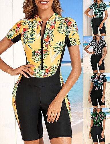 Mulheres Anti Atrito roupa de banho Floral Retalhos Estampado Zíper Frontal Perna até o meio da coxa Secagem Rápida Leve Respirável Manga Curta Body Roupa de banho Surfe Praia Esportes Aquáticos Verão
