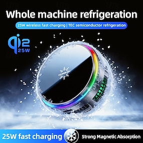 Carregador sem fio magnético de 25 W e resfriador de celular, radiador de refrigeração TEC Semiconductor com luz RGB, ventilador de resfriamento de carregamento rápido compatível com iPhone 17/16/15/14/13, MagSafe e Android.