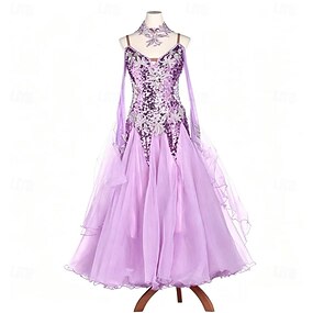 vestido de dança de salão feminino com strass, manga longa, vestido de competição de valsa e tango com punhos largos e saia esvoaçante – roxo