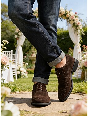 Sapatos Oxford masculinos marrons e brancos com bico em asa – estilo clássico, ideais para cerimônias de casamento e ocasiões formais.