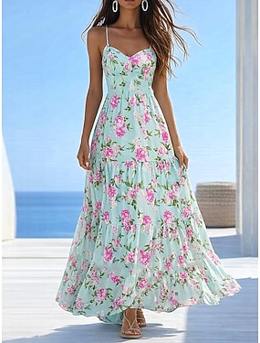 Mulheres Vestido Longo Vestido A Line Vestido de decote Férias Casual Ao ar livre Para Noite Normal Floral Gráfico Sem Manga Decote V Verde Verão Primavera