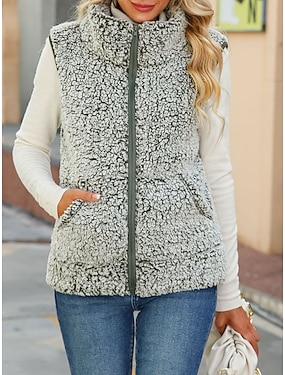 Mulheres Casaco de lã colete de lã Casaco de pelúcia Manter Quente Respirável Zíper Bolsos Forrada com Fleece Casual Tecido Férias Rua Roupa Diária Para Noite Zíper Padrão Colarinho Chinês Normal Sem