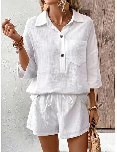 Mulheres Conjuntos de duas peças Camisa de algodão Conjuntos de shorts Manga Curta Colarinho de Camisa Tecido Moda Roupa de rua Casual Diário Ao ar livre Preto Marfim Rosa Verão Normal