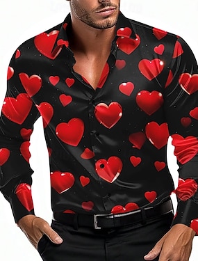 Dia dos Namorados Homens Coração Amor Blusa de cetim camisa de botão Manga Longa Moda Casual Festa Presente Feriado Primavera Outono Aberto para a Lateral Impressão 3D Preto Rosa Azul Roxo Verde