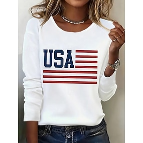 Dia da Independência Camiseta Feminina Patriótica Impressão Gráfica Bandeira Bandeira Americana Estilosa Clássica Casual Manga Longa Decote Redondo Tops Regulares Diário Azul Preto Branco Vermelho