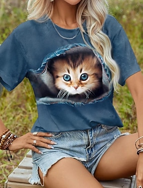 Womens T shirt Cute Kitten Peekaboo Graphic Crew Neck Short Sleeve Casual Daily Wear Soft Comfortable Unique Print Top Blue Regular and Plus Size