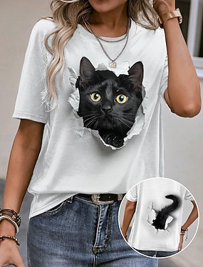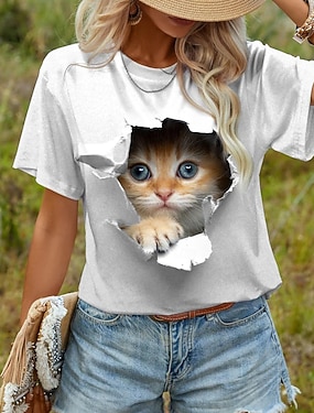 Camiseta Feminina Casual Manga Curta Decote Redondo Gato Impressão 3D Ilusão Gráfica Novidade Tee Branca Respirável Macia Confortável Verão Vestuário Diário Roupas para Amantes de Animais de Estimação