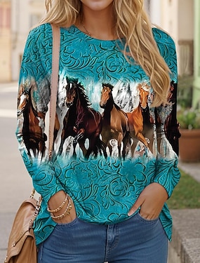 Camiseta Feminina de Manga Longa Gola Careca Manga Longa Tunic Impressão Casual de Cavalo Tops Regulares Diários Azul Primavera Outono Pré-inverno
