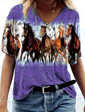 camiseta feminina casual estampa de cavalo manga curta regular tops decote em v diário azul roxo verde verão