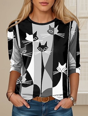 Camiseta Feminina de Manga Longa Gola Redonda Longa Tunic Casual Ombre Impressão de Gato Tops Regulares Diários Pretos Primavera Outono Pré-Outono