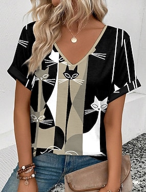 camiseta feminina básica casual bloco de cores estampa de gato manga curta regular tops decote em v diário preto e branco azul laranja verão