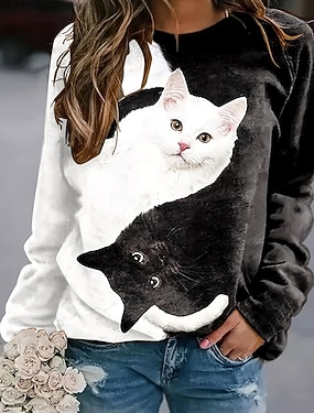 moletom feminino gato street dailywear estampa casual gola redonda manga comprida microelástico outono inverno confortável respirável tecido macio
