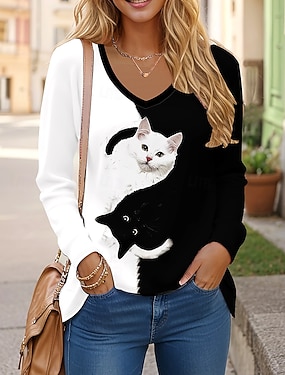 Camiseta Feminina Decote em V Manga Longa Tunic Tee Gato Diária Fashion Branco Preto Primavera e Outono
