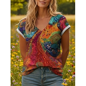 Mulheres Camiseta Imprimir Gráfico Graffiti Boêmia Vintage Casual Manga Curta Decote V Tops regulares Diário Azul Verão Primavera
