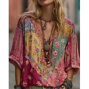 Mulheres camisa Boho Blusa Imprimir Floral Vintage Diário Casual Manga Longa Decote V Tops regulares Diário Feriado Azul Amarelo Vermelho Roxo Fúcsia Verão Primavera Outono
