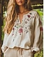 Mulheres Camisa Social Camisas de algodão e linho camisa Boho Blusa Bordado Floral Gráfico Boêmia Vintage à moda Manga Longa Decote V Tops regulares Diário Feriado Para Noite Rosa cor de Rosa Verão