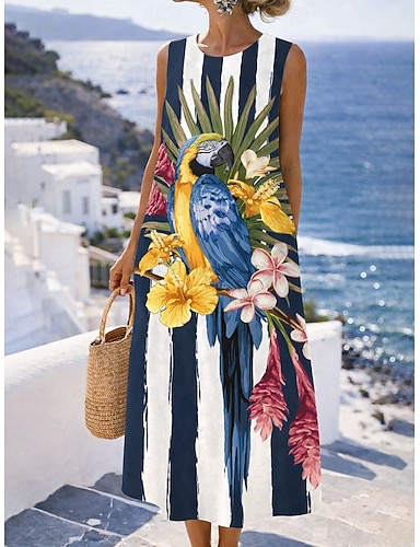 Mulheres Vestido midi Vestido de turno Vestidos Para o Verão Vestido A Line Férias Casual Boho Praia Festa Normal Floral Gráfico Sem Manga Gola Redonda Azul Preto Branco Amarelo Verão Primavera