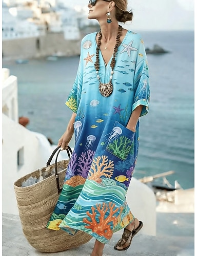 Vestido Maxi Feminino Linho Semelhante Respirável Leve Vestido de Verão Casual Boho Praia Corte Solto Gráfico Geométrico Manga 3/4 Decote em V Azul Rosa Vermelho Laranja Primavera Verão