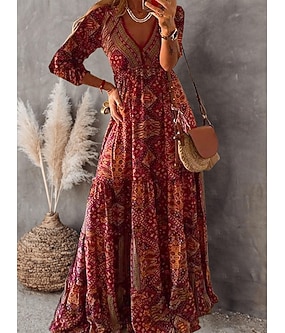 Mulheres Vestido Longo Vestido de turno Casual Ao ar livre Para Noite Ajuste Largo Floral Manga 3/4 Decote V Azul Vermelho Verão Primavera