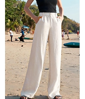 Mulheres Calças de linho de algodão Perna larga Calças Moda Comprimento total Tecido Bolsos laterais Perna larga Respirabilidade Confortável Sem Elasticidade Casual / Diário Preto Branco Cáqui