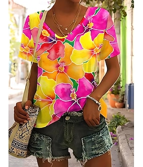 Mulheres Camiseta Imprimir Floral Gráfico Plantas Vintage à moda Clássico Manga Curta Decote V Tops regulares Diário Amarelo Rosa Verde Verão Primavera