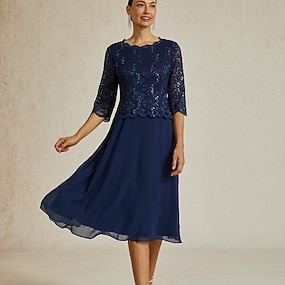 Mulheres Vestido midi Vestido de chiffon Elegante Festa Aniversário Normal Côr Sólida Manga 3/4 Gola Redonda Azul Marinha