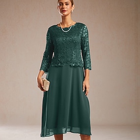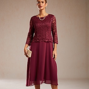 Mulheres Vestido midi Vestido A Line Elegante Festa de Noite Convidado do casamento Renda Normal Côr Sólida Manga 3/4 Gola Redonda Vinho