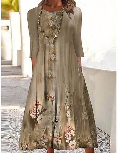 Mulheres Vestido midi Vestido A Line Vestido justo e evasê Aniversário Casual Boho Festa Convidado do casamento Diário Floral Gráfico Manga Longa Gola Redonda Vermelho Camelo Roxo Verde