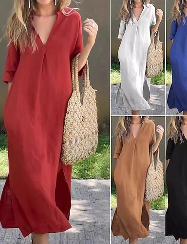 Mulheres Vestido Longo Vestido de turno Vestido de verão Casual Diário Ajuste Largo Tecido Manga 3/4 Decote V Azul Preto Branco Vermelho Verão Primavera Outono