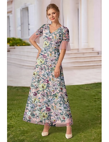 Linha A Vestidos Longo Até o Tornozelo Bordado com miçangas Vestido de festa Vestido Coquetel Vestido Para Mãe dos Noivos Manga Curta Decote V Elegante Vintage Formal Renda Tule Renda com Miçangas com