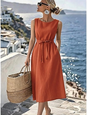 Mulheres Vestido midi Linho de algodão sintético Vestido A Line Vestido de verão Casual Diário Normal Tecido Sem Manga Gola Redonda Laranja Azul Escuro Bege Cinzento Verão
