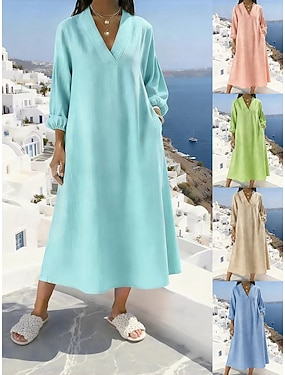 Mulheres Vestido Longo Linho de algodão sintético Camisetão Vestido Kaftan Vestido casual Básico Casual Diário Férias Normal Tecido Manga Longa Decote V Rosa Verde cáqui Azul Escuro Verão Primavera