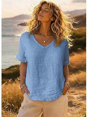 Mulheres Camiseta Camiseta de algodão e linho Linho de algodão sintético T-shirt Patchwork Tecido Clássico Casual Manga Curta Decote V Tops regulares Diário Para Noite Final de semana Azul Céu
