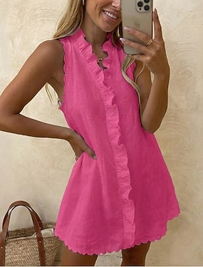 Mulheres Botão para cima Linho de algodão sintético Frufru Côr Sólida Básico Casual Sem Manga Gola Redonda Tops regulares Diário Preto Branco Vermelho Verão Primavera